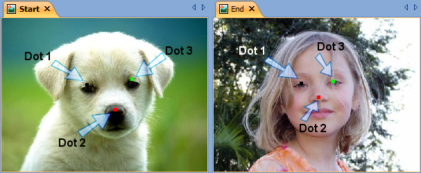 Each dot pair will start out at the location on the starting picture, and move through the morph to its location given on the ending picture.