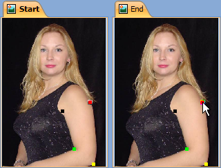 We want to adjust the dots in the picture window labeled End until they represent how you want the last frame of your warp animation to look. When you hover over a dot, you should notice that it glows with a colorful outline, and its partner dot glows with a black and white outline. Simply click on the dot, hold the mouse button down, drag the dot to a new location, and then release the mouse button.