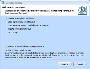 To quickly get started using Morpheus Photo Mixer, use the Layout Wizard. The wizard will guide you through the creation of a new layout, or it will let you