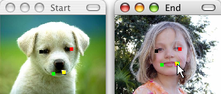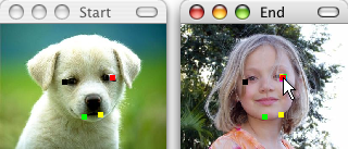 We want to align the dots in the picture window labeled End to match the picture elements their partner dots are located around in the starting picture. When you hover over a dot, you should notice that it glows with a colorful outline, and its partner dot glows with a black and white outline. Simply click on the dot, hold the mouse button down, drag the dot to a new location, and then release the mouse button.
