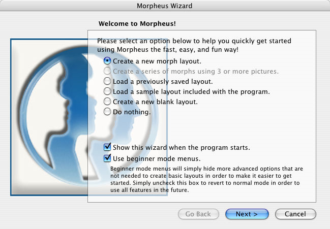To quickly get started using Morpheus Photo Morpher Mac, use the Layout Wizard. The wizard will guide you through the creation of a new layout, or it will let you